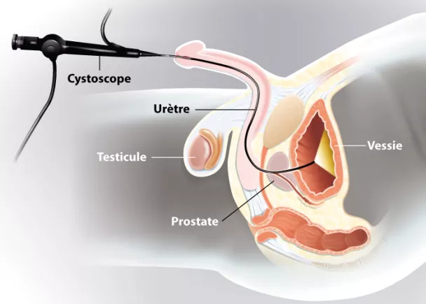 La cystoscopie consiste à introduire par l’urètre un fin tube souple muni d’une source lumineuse permettant de voir l’intérieur de la vessie et, au passage, celui de l’urètre.