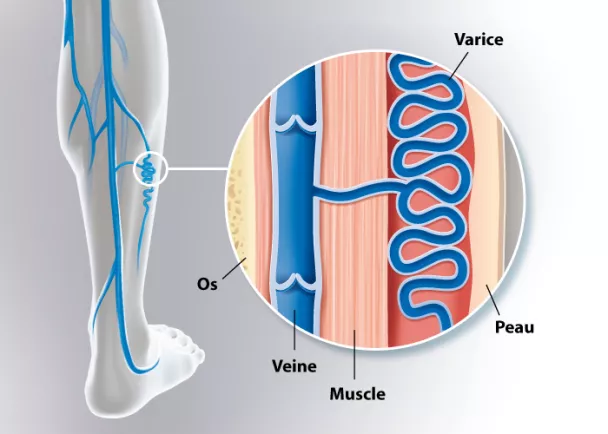 Une varice est une veine superficielle dilatée, dans laquelle la circulation sanguine se fait à contre-courant. Elles apparaissent progressivement au cours des années au niveau des jambes (ou membres inférieurs) sur un terrain prédisposé. Une fois formées, les varices sont permanentes et les veines restent dilatées en position debout. Les varices des membres inférieurs doivent être traitées pour éviter l’apparition de complications. Différents types d’interventions sont possibles en fonction du stade de la maladie veineuse.