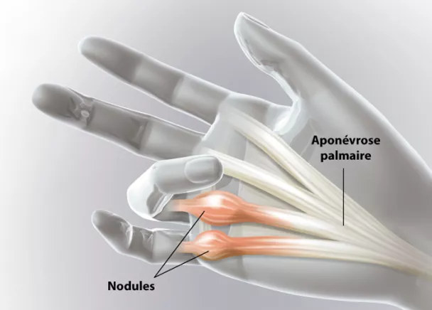 La maladie de Dupuytren consiste en un épaississement fibreux de la membrane située sous la peau de la paume de la main et/ou de la face palmaire des doigts (annulaire et auriculaire, préférentiellement). Cette membrane recouvre les tendons qui permettent de plier les doigts (les tendons fléchisseurs). La surface de la paume en est déformée, parcourue de bosses, de plis et de cordes (des brides fibreuses). Les brides en se rétractant obligent les doigts à fléchir progressivement, de façon irréductible.